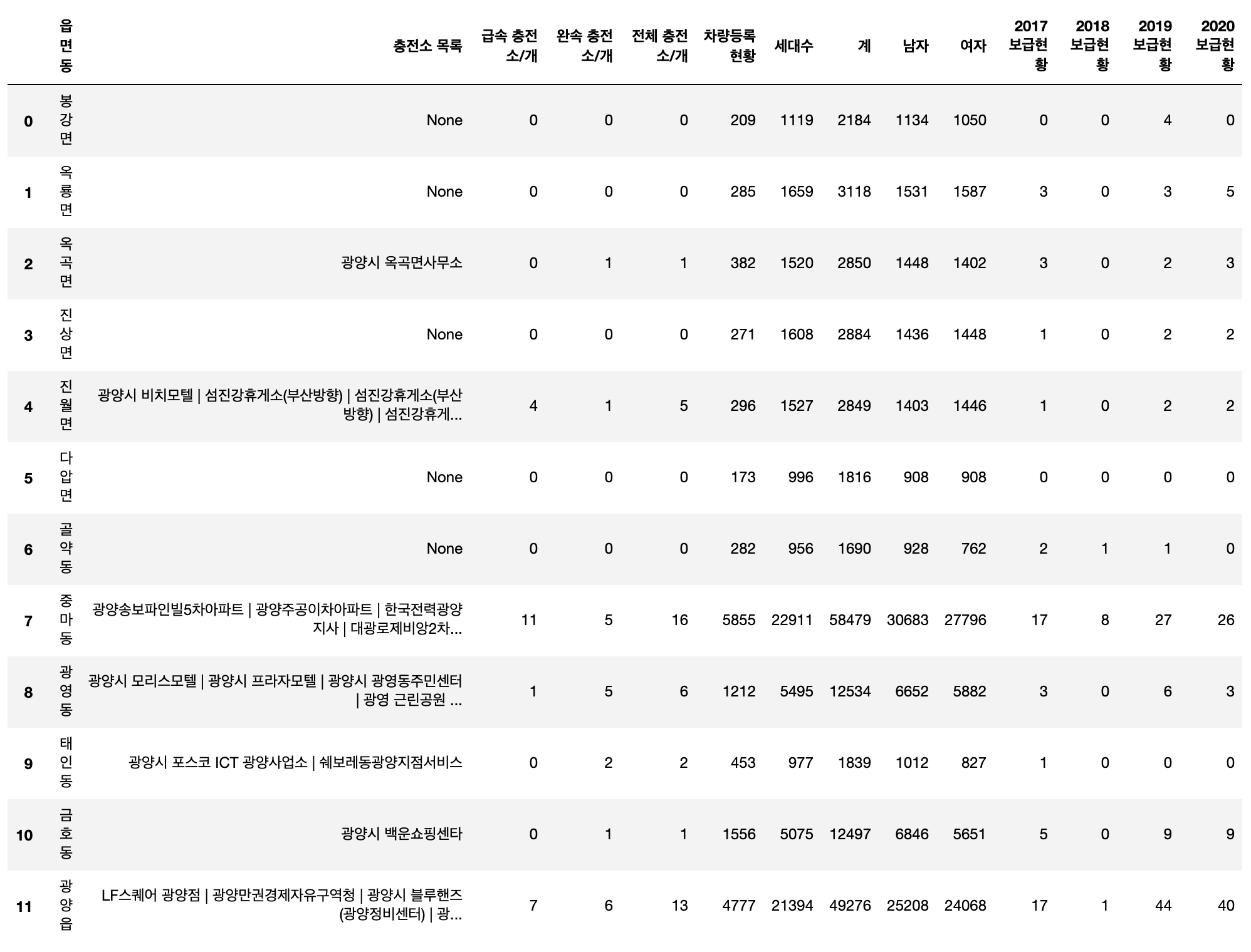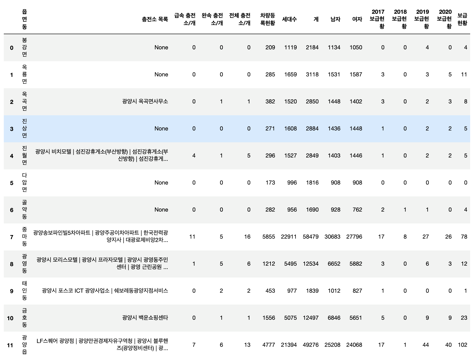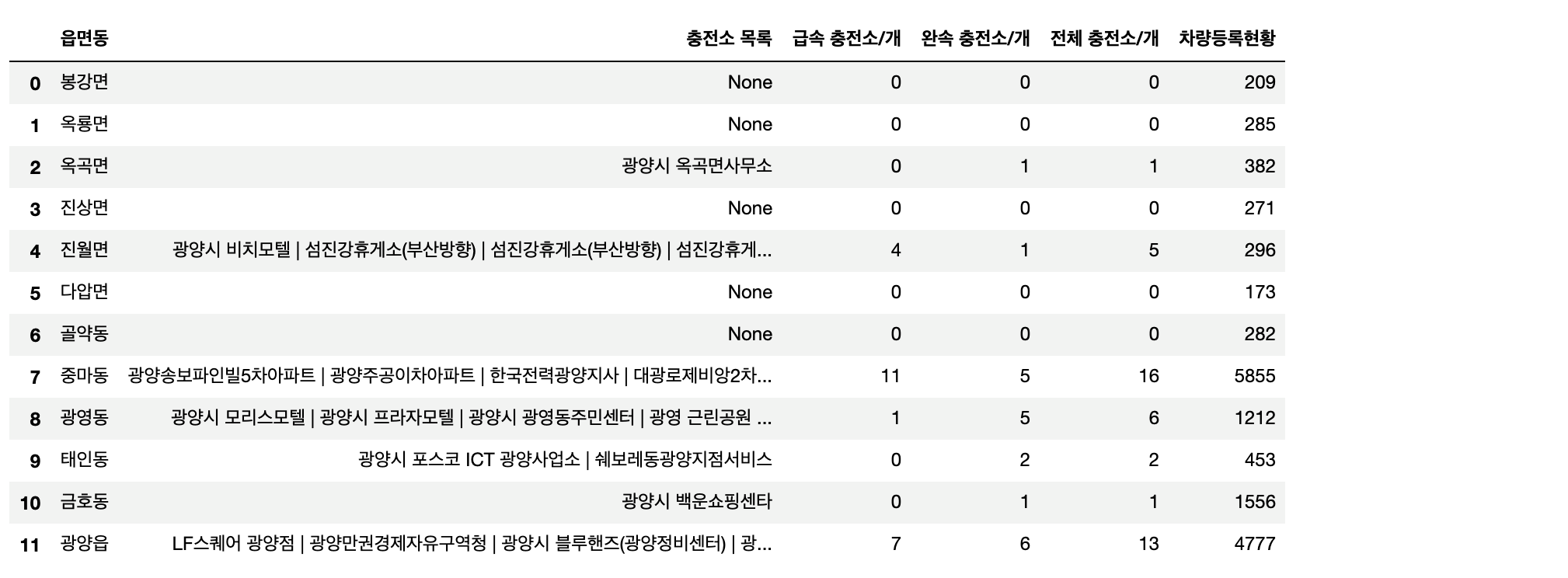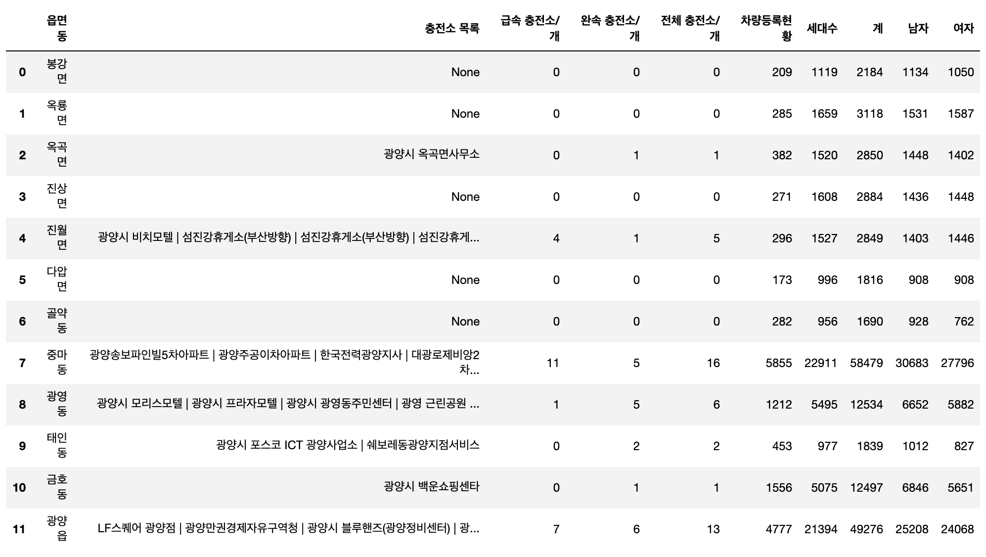 [COMPAS 광양시] 주어진 데이터를 활용하여 행정동별 정보를 모아보자! ( 충전소, 인구 수, 전기차 보급현황 )