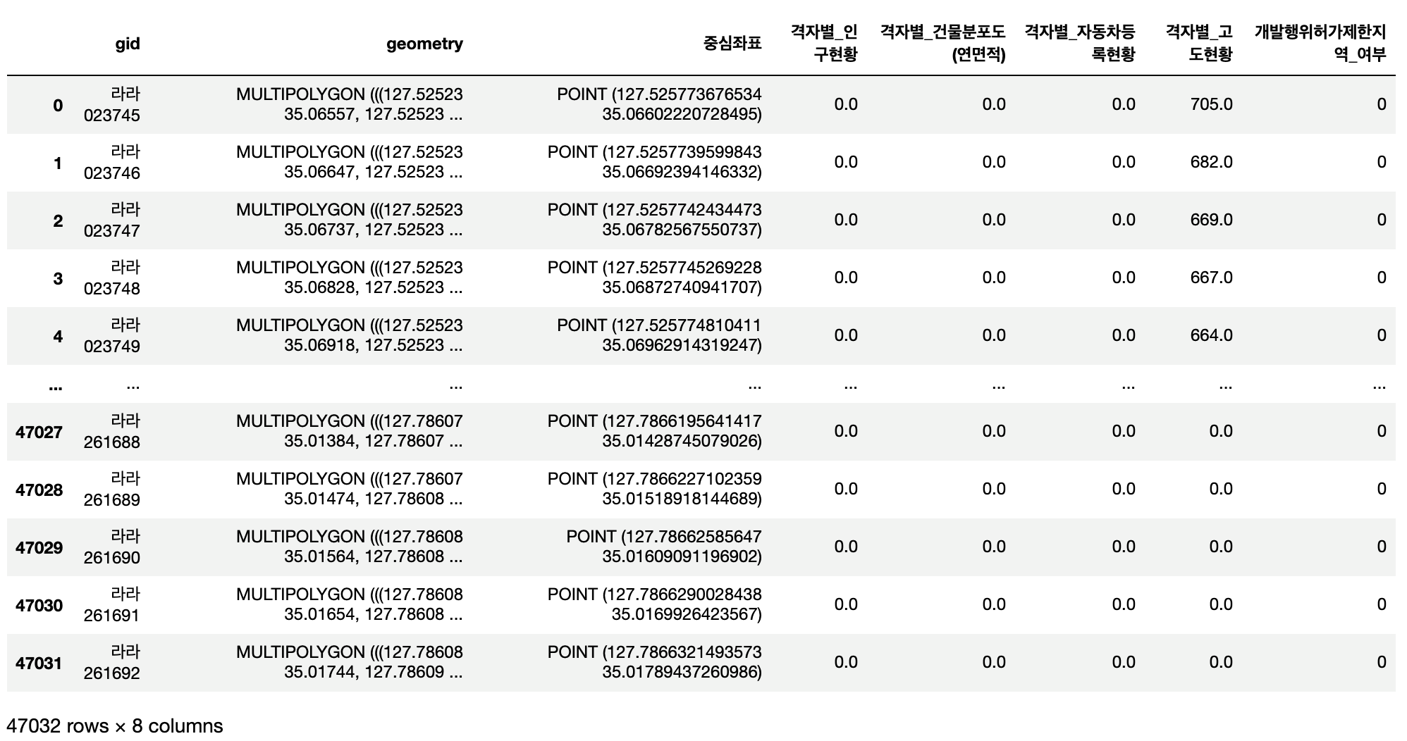 먼저 격자별 인구 현황과 격자별 건물 분포도의 gid, geometry 값이 같으므로 이를 바탕으로 하나로 합쳐줍니다.