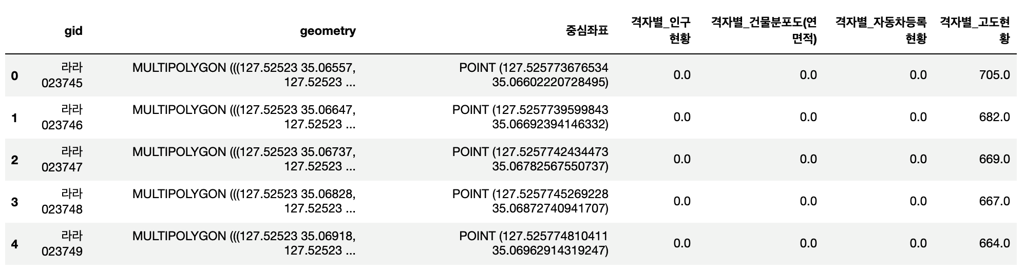 격자별 자동차 등록현황, 격자별 인구현황, 격자별 건물분포도, 격자별 고도정보를 불러왔습니다.