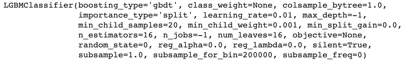lgb6 = LGBMClassifier(learning_rate=0.01, n_jobs=-1, n_estimators=16, random_state=0, num_leaves=16)