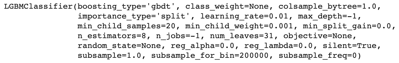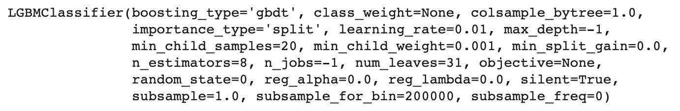 lgb5 = LGBMClassifier(learning_rate=0.01, n_jobs=-1, n_estimators=8, random_state=0)
