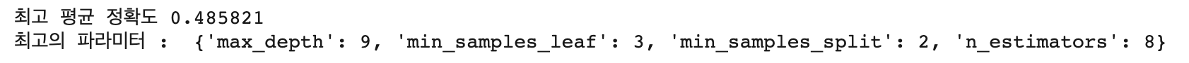 print("최고 평균 정확도 {0:4f}".format(rf_grid.best_score_))